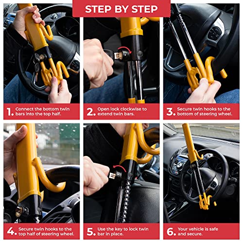 EASY TO LOCK, TOUGH TO REMOVE – Thwart Thieves’ Attempts: Locking your steering wheel is effortless with our user-friendly design. However, removing it without the keys is an entirely different challenge. The Twin Bar Car Wheel Lock has an advanced locking mechanism which makes it extremely difficult for thieves to tamper with or remove.