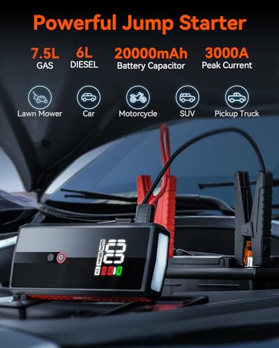 VANTRUE 3000A Jump Starter Power Pack, Car Battery Booster Jump Starter for 12V Vehicles 7.5L Gas/6.0L Diesel, 20000mAh Portable Jump Starter Jump Leads with LCD Screen and LED Flashlight QC3.0, JS1