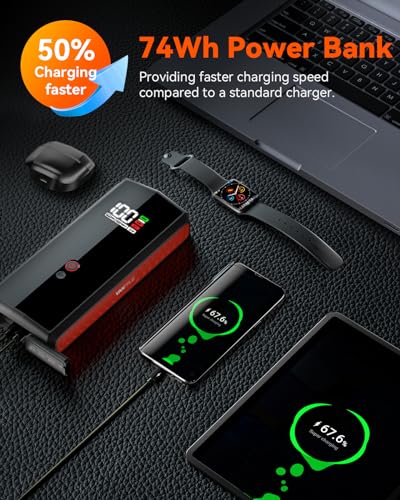 【Multi-Purpose & Intelligent Power Bank】20000 mAh high-capacity power bank with multiple output modes including PD 65W, USB A QC3.0 and DC 15V/10A, can be used as a backup power supply in almost any situation. This car jump starter power bank can fully charge mobile phones in 30 minutes, so you don’t have to worry anything once you’re hurry to go out. Beside, it will automatically turn off after 4 hours charging or 2 minutes without any operation, effectively avoids safety hazards in the car.