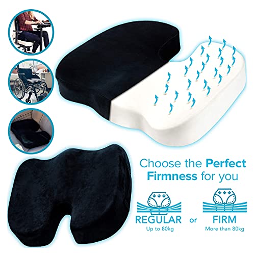 2 LEVELS OF FIRMNESS: YOUR SHORTCUT TO COMFORT. Other memory foam cushions are too squishy or too hard, making it quite difficult to find the right firmness for you. We have created 2 levels of firmness: REGULAR – up to 80kg, and FIRM – more than 80kg. The size of the cushion is 45x36x8cm.
