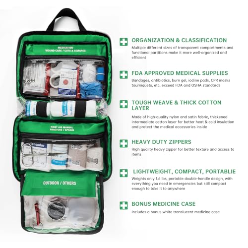 【ALWAYS READY】For your family and friends, go on hassle-free trips with this premium first aid kit! Perfect for home, office, camping, hiking, boating, car, sports, travel, road trips, workplace, school, etc.