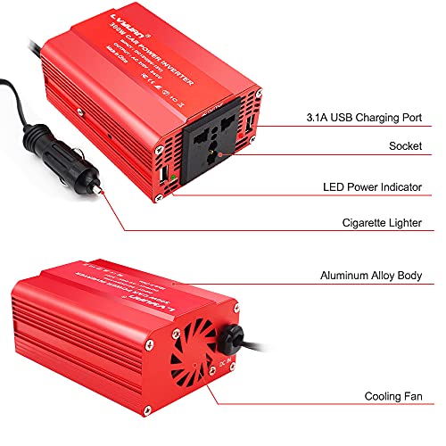 Cantonape 300W Car Power Inverter 12V to 230V 240V Converter, Dual USB 4.8A Charging Ports – Charge Your Laptop, iPad, iPhone, Tablet, Consoles & More – Durable and Powerful,Red Aluminum Body