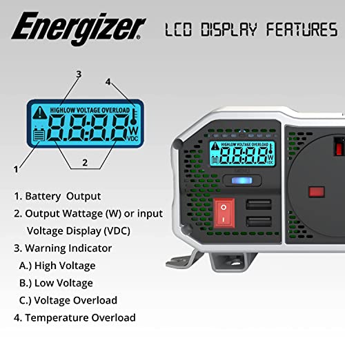 ENERGIZER CAR POWER INVERTER – 1500 watt continuous power, 3000 watts peak power. Modified sine wave car inverter converts 12V DC to 230V / 240V AC power. Make this inverter your essential caravan and car accessories. Simply connect DC battery cables directly to your car battery and you have a portable power station.