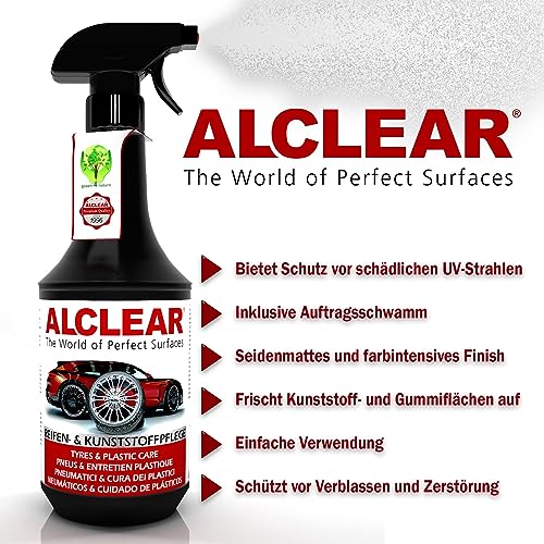 ALCLEAR Car Tyre Shine Tyre and Plastic Care. The 721RK protects all seals, plastic and rubber parts on the vehicle. The material remains soft and supple. Plastics and rubber are refreshed in colour and protected against UV radiation. The milky liquid is non-sticky and can be applied easily and precisely. After a few moments, the surface shimmers silk-matt and colour-intensive. Applictaion: Each order comes with an applicator sponge for easy and effective application. Apply the 721RK to the tyre sidewall. Repeat several times if necessary. After application, your tyres will shine again in a rich, matt black without “flab”, making alloy wheels look bigger.