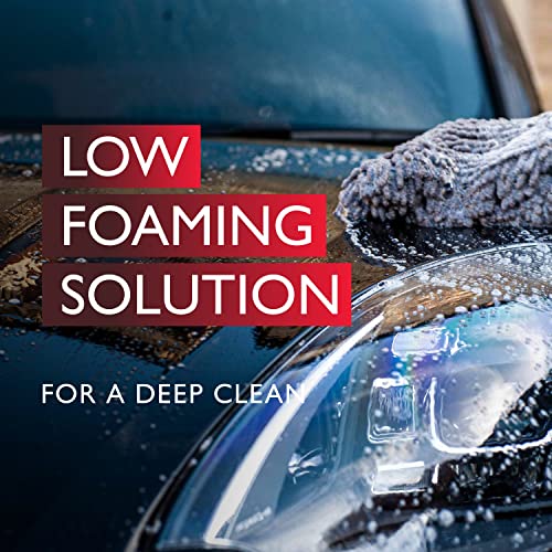 A low foam deep cleaning car wash shampoo that leaves a glossy, water-repelling wax-like protection in one easy step