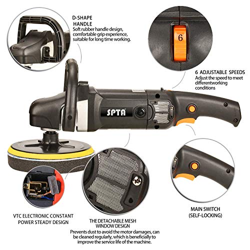 Specification: Electric Car Polisher, SPTA 7 Inch 180mm Rotary Polisher Car Polisher Electric Polisher RO Polisher & Polishing Pads Set for Auto Buffing and Polishing