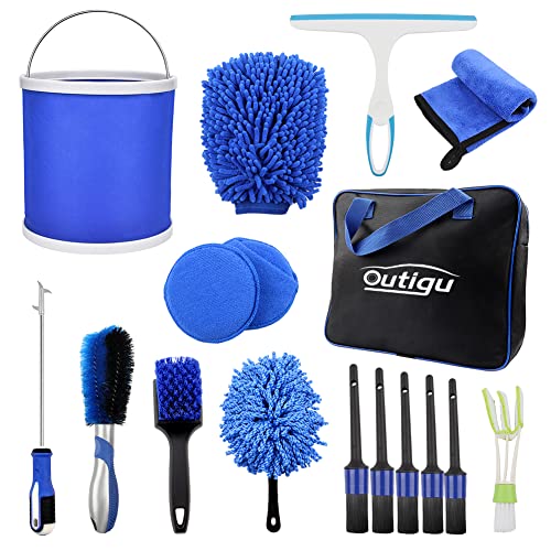 Outigu Professional Car Cleaning Kit, 17PCS Exterior and Interior Car Washing Products with Bag, Wheel Brush, Bucket, Air Vent Brush, Washing Gloves, Sponges, Window Scraper, Duster, Detail Brush (17)