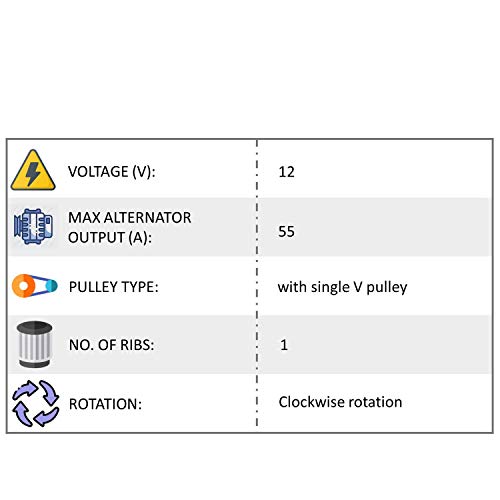 〔SPECIFICATIONS〕 Product Type: Alternator ◦ Condition: New ◦ Voltage: 12V ◦ Amperage: 55A ◦ Rotation: CW ◦ Regulator/Fan: IR/IF ◦ Plug Code: 282 ◦ Pulley Class: V1 ◦ Mounting Hardware Included: No ◦ Number of Pieces: 1