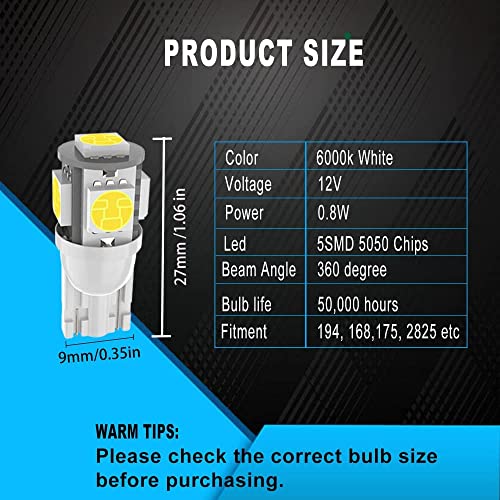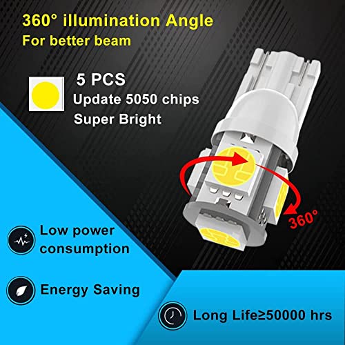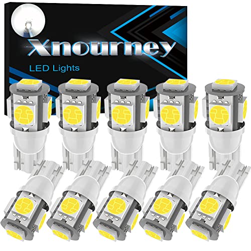 Xnourney 10PCS T10 194 168 Led Car Bulb 6000K White Light, Upgrade 5 SMD 5050 Chipset 2825 W5W 175 158 LED Light for Map Dome Door Courtesy License Plate Side Marker Light T10 Led Car Bulb