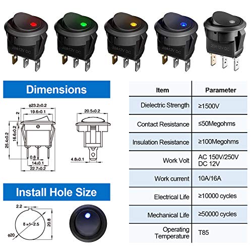 ☛About Rocker Switches:This rocker switch round is simple, convenient and easy to install. it can be used to switch the power supply to a circuit.Rated load: DC 12V, 20A; Type: 3 pins with LED lighted SPST ON/ Off Switch.It is made of high-quality nylon and metal for durability.